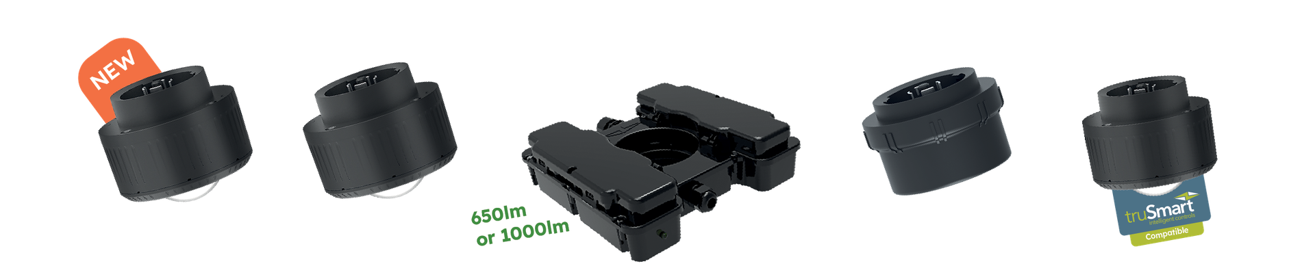 Emergency packs available in 650lm & 1000lm and sensor options including PIR, Microwave & truSmart.